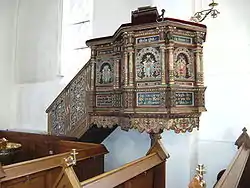 La chaire est constituée[3] de la cuve[4] qui constitue la place du prédicateur, et parfois d'un dossier qui à l'arrière relie la cuve à la partie supérieure appelée abat-voix[5].