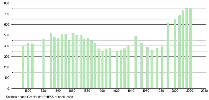 L'évolution du nombre d'habitants est connue à travers les recensements de la population effectués dans la commune depuis 1793. Pour les communes de moins de 10 000 habitants, une enquête de recensement portant sur toute la population est réalisée tous les cinq ans, les populations légales des années intermédiaires étant quant à elles estimées par interpolation ou extrapolation[46]. Pour la commune, le premier recensement exhaustif entrant dans le cadre du nouveau dispositif a été réalisé en 2005[47].