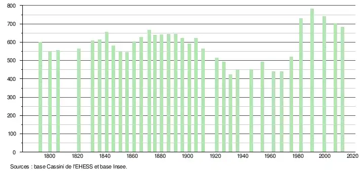 L'évolution du nombre d'habitants est connue à travers les recensements de la population effectués dans la commune depuis 1793. À partir du , les populations légales des communes sont publiées annuellement dans le cadre d'un recensement qui repose désormais sur une collecte d'information annuelle, concernant successivement tous les territoires communaux au cours d'une période de cinq ans. Pour les communes de moins de 10 000 habitants, une enquête de recensement portant sur toute la population est réalisée tous les cinq ans, les populations légales des années intermédiaires étant quant à elles estimées par interpolation ou extrapolation[14]. Pour la commune, le premier recensement exhaustif entrant dans le cadre du nouveau dispositif a été réalisé en 2007[15],[Note 2].
