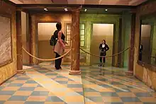 - la pièce apparaît cubique si elle est observée à partir d'un point spécial (la vision doit s'effectuer avec un seul œil, afin d'éliminer l'effet stéréoscopique, en fait elle est trapézoïdale) ;