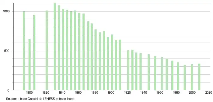 - Dans le tableau des recensements et le graphique, par convention dans Wikipédia, le principe a été retenu, pour les populations légales postérieures à 1999 de n’afficher dans le tableau des recensements et le graphique que les populations correspondant à l'année 2006, première population légale publiée calculée conformément aux concepts définis dans le décret no 2003-485 du 5 juin 2003, et les années correspondant à une enquête exhaustive de recensement pour les communes de moins de 10 000 habitants, ainsi que la dernière population légale publiée par l’Insee.