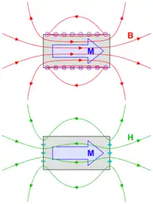 - l'autre, noté , qui est en pratique plutôt utilisé dans l'étude de l'électromagnétisme des milieux continus, décrit au niveau local l'« aimantation » propre de la matière, ou son « excitation magnétique »[1] sous l'effet d'un champ électromagnétique externe (dont l'effet global confère en particulier à un corps donné un moment magnétique d'ensemble). Il s'exprime en ampères par mètre (de symbole A/m ou A m−1)[alpha 2].