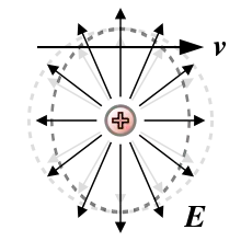 ![]() Une particule chargée, au repos par rapport à l'observateur, dans le vide, engendre un champ électrique isotrope, identique dans toutes les directions de l'espace. |