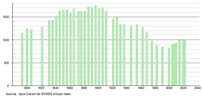 L'évolution du nombre d'habitants est connue à travers les recensements de la population effectués dans la commune depuis 1793. Pour les communes de moins de 10 000 habitants, une enquête de recensement portant sur toute la population est réalisée tous les cinq ans, les populations légales des années intermédiaires étant quant à elles estimées par interpolation ou extrapolation[30]. Pour la commune, le premier recensement exhaustif entrant dans le cadre du nouveau dispositif a été réalisé en 2004[31].