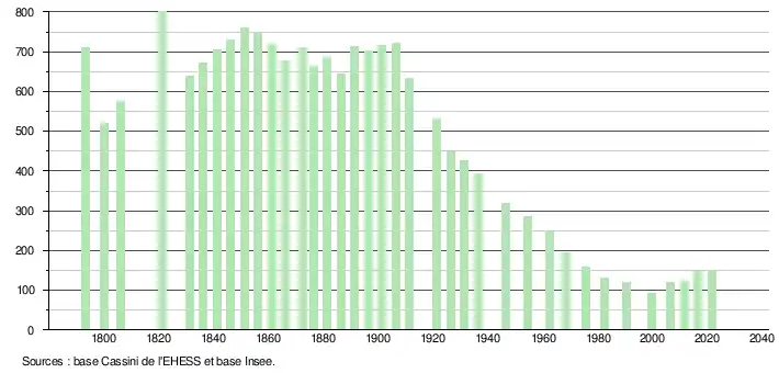 L'évolution du nombre d'habitants est connue à travers les recensements de la population effectués dans la commune depuis 1793. Pour les communes de moins de 10 000 habitants, une enquête de recensement portant sur toute la population est réalisée tous les cinq ans, les populations légales des années intermédiaires étant quant à elles estimées par interpolation ou extrapolation[15]. Pour la commune, le premier recensement exhaustif entrant dans le cadre du nouveau dispositif a été réalisé en 2006[16].