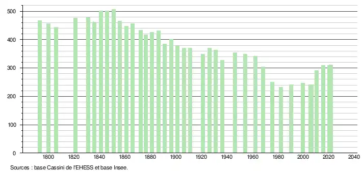 L'évolution du nombre d'habitants est connue à travers les recensements de la population effectués dans la commune depuis 1793. Pour les communes de moins de 10 000 habitants, une enquête de recensement portant sur toute la population est réalisée tous les cinq ans, les populations légales des années intermédiaires étant quant à elles estimées par interpolation ou extrapolation[14]. Pour la commune, le premier recensement exhaustif entrant dans le cadre du nouveau dispositif a été réalisé en 2005[15].
