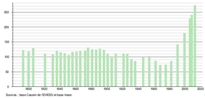 L'évolution du nombre d'habitants est connue à travers les recensements de la population effectués dans la commune depuis 1793. À partir du , les populations légales des communes sont publiées annuellement dans le cadre d'un recensement qui repose désormais sur une collecte d'information annuelle, concernant successivement tous les territoires communaux au cours d'une période de cinq ans. Pour les communes de moins de 10 000 habitants, une enquête de recensement portant sur toute la population est réalisée tous les cinq ans, les populations légales des années intermédiaires étant quant à elles estimées par interpolation ou extrapolation[2]. Pour la commune, le premier recensement exhaustif entrant dans le cadre du nouveau dispositif a été réalisé en [3],[Note 1].