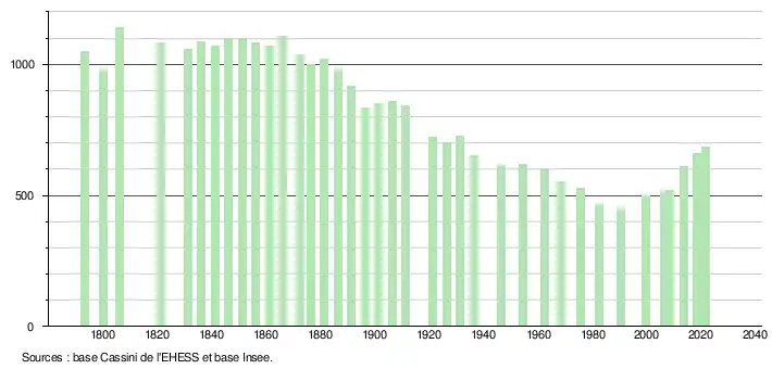 L'évolution du nombre d'habitants est connue à travers les recensements de la population effectués dans la commune depuis 1793. Pour les communes de moins de 10 000 habitants, une enquête de recensement portant sur toute la population est réalisée tous les cinq ans, les populations légales des années intermédiaires étant quant à elles estimées par interpolation ou extrapolation[21]. Pour la commune, le premier recensement exhaustif entrant dans le cadre du nouveau dispositif a été réalisé en 2008[22].