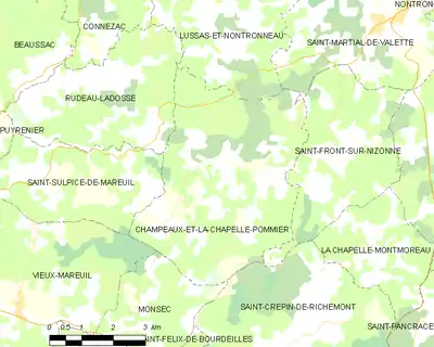 En 2016, année précédant la création de la commune nouvelle de Mareuil en Périgord, Champeaux-et-la-Chapelle-Pommier était limitrophe de huit autres communes. À l'est, le territoire de La Chapelle-Montmoreau était distant de moins de 600 mètres.