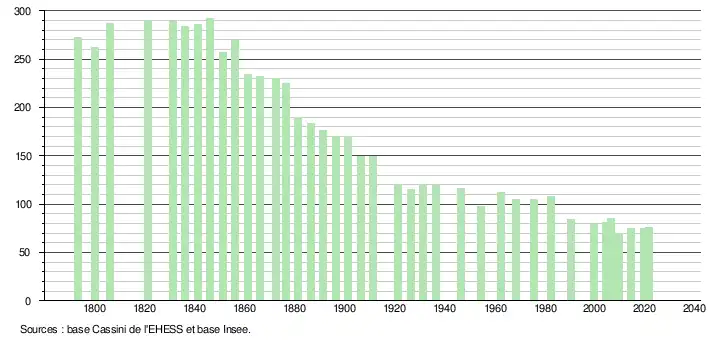 L'évolution du nombre d'habitants est connue à travers les recensements de la population effectués dans la commune depuis 1793. Pour les communes de moins de 10 000 habitants, une enquête de recensement portant sur toute la population est réalisée tous les cinq ans, les populations légales des années intermédiaires étant quant à elles estimées par interpolation ou extrapolation[13]. Pour la commune, le premier recensement exhaustif entrant dans le cadre du nouveau dispositif a été réalisé en 2004[14].