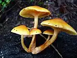 La composition des champignons magiques varie d'un genre à l'autre et d'une espèce à l'autre[24]. Son composant principal est la psilocybine[25] qui est convertie en psilocine pour produire un effet psychoactif. En outre, la psilocine, la norpsilocine, la baeocystine, la norbaeocystine et l'aeruginascine peuvent également être présentes, ce qui peut modifier les effets des champignons magiques[24]. Certains champignons produisent des β-carbolines qui inhibent la monoamine oxydase, une enzyme qui décompose les alcaloïdes de tryptamine. Ils se produisent dans différents genres, tels que Psilocybe[26], Cyclocybe[27] et Hygrophorus[28]. L'harmine, l'harmane, le norharmane et une gamme d'autres β-carbolines dérivées du L-tryptophane ont été découverts chez les espèces de Psilocybe.