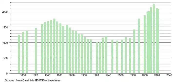 L'évolution du nombre d'habitants est connue à travers les recensements de la population effectués dans la commune depuis 1793. Pour les communes de moins de 10 000 habitants, une enquête de recensement portant sur toute la population est réalisée tous les cinq ans, les populations légales des années intermédiaires étant quant à elles estimées par interpolation ou extrapolation[21]. Pour la commune, le premier recensement exhaustif entrant dans le cadre du nouveau dispositif a été réalisé en 2004[22].