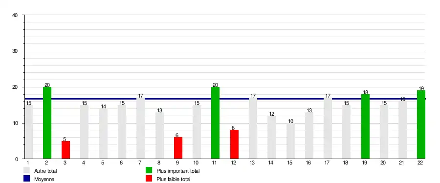 Ce graphique représente le nombre de buts marqués lors de chaque journée. Le total est de 315 buts en 132 matches (2, 38 but par match), ce qui donne une moyenne de 14,36 buts par journée.
