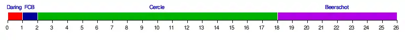 | R. Beerschot AC | 7 | 6 | 8 | 6 | 5 | 3 | 4 | 4-1 | 4-1 | 3-1 | 3-2 | 3-3 | 2-3 | 2-3 | 2-3 | 2-3 | 2-3 | 2-3 | 1-3 | 1-3 | 1-3 | 1-3 | 1-3 | 1-3 | 1-3 | 1-3 | 1 |
