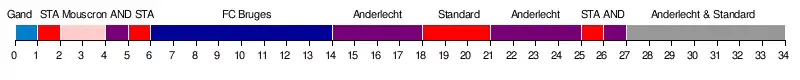 Cinq équipes différentes ont occupé la tête du classement durant la saison : La Gantoise, l'Excelsior Mouscron, le FC Bruges, le Standard de Liège et le Sporting Anderlecht, ces deux dernières clubs l'occupant conjointement durant sept journées.