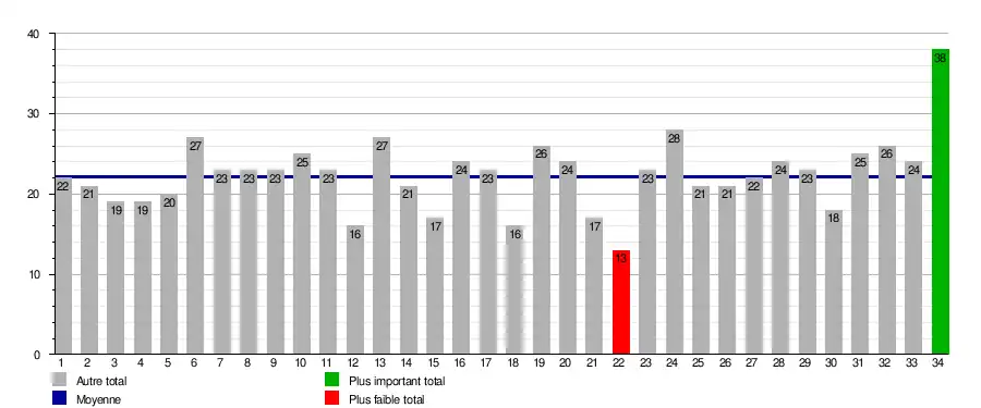 | Villefranche | 11 | 15 | 10 | 12 | 14 | 14 | 10 | 12 | 13 | 15 | 12 | 8 | 11 | 11 | 12 | 13 | 13 | 11 | 12 | 13 | 13 | 14 | 12 | 13 | 14 | 13 | 14 | 14 | 14 | 14 | 13 | 11 | 9 | 6 | 18 |