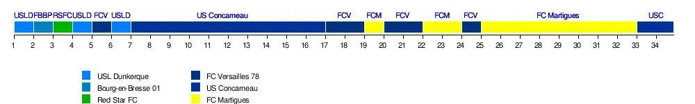 | Concarneau | 9 | 5 | 2 | 10 | 8 | 2 | 1 | 1 | 1 | 1 | 1 | 1 | 1 | 1 | 1 | 1 | 4 | 4 | 4 | 5 | 4 | 3 | 2 | 3 | 3 | 3 | 4 | 2 | 2 | 2 | 2 | 2 | 1 | 1 | 20 | |
