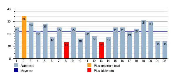 Ce graphique représente le nombre de buts marqués lors de chaque journée. Il est également indiqué la moyenne totale sur la saison qui est de 22,18 buts/journée.