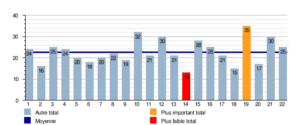 Ce graphique représente le nombre de buts marqués lors de chaque journée. Il est également indiqué la moyenne totale sur la saison qui est de 22,77 buts/journée.