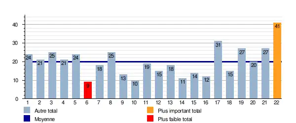 Ce graphique représente le nombre de buts marqués lors de chaque journée. Il est également indiqué la moyenne totale sur la saison qui est de 20 buts/journée.
