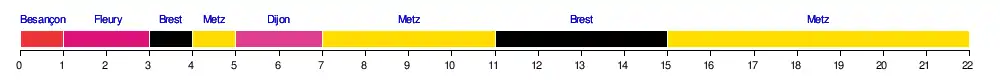 | Besançon | 1 | 2 | 2 | 6 ex | 7 -1 | 9 | 6 | 6 | 6 | 5 | 5 | 4 | 3 | 3 | 4 ex | 4 -1 | 4 | 5 | 6 | 6 | 4 | 4 |