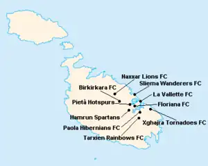 L'île de Malte étant relativement petite, les clubs évoluent tous au stade National Ta'Qali (17 400 places). Certain cependant ont leur propre enceinte qu'ils peuvent éventuellement utiliser.