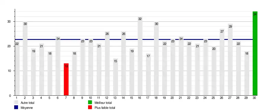 | Journée ? | 1 | 2 | 3 | 4 | 5 | 6 | 7 | 8 | 9 | 10 | 11 | 12 | 13 | 14 | 15 | 16 | 17 | 18 | 19 | 20 | 21 | 22 | 23 | 24 | 25 | 26 | 27 | 28 | 29 | 30 | Journées en tête | Journées relégable |