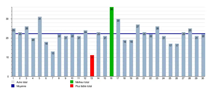 | Journée ? | 1 | 2 | 3 | 4 | 5 | 6 | 7 | 8 | 9 | 10 | 11 | 12 | 13 | 14 | 15 | 16 | 17 | 18 | 19 | 20 | 21 | 22 | 23 | 24 | 25 | 26 | 27 | 28 | 29 | 30 | Journées en tête | Journées relégable |