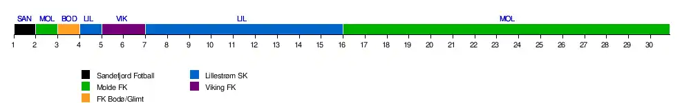 La frise chronologique ci-dessous montre le club leader d'Eliteserien à chaque journée[1].