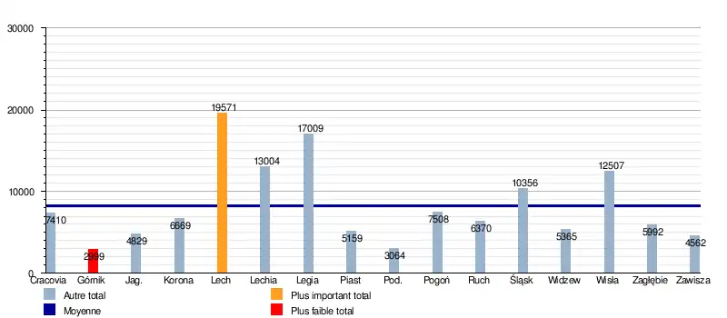 Ce graphique présente pour chaque club la moyenne par match des affluences enregistrées dans leur stade. Cette saison, elle s'établit dans le championnat à 8 319 spectateurs[16], en très légère augmentation par rapport à la saison précédente (où elle était de 8 314 spectateurs par match). Exactement 2 462 445 spectateurs ont assisté à un match d'Ekstraklasa[16], dont 38 458 pour la rencontre Lech Poznań – Legia Varsovie, la plus prolifique dans ce domaine[17].