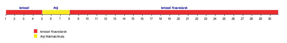 | Ienisseï | 16 | 16 | 16 | 16 | 12 | 13 | 13 | 16 | 16 | 16 | 16 | 16 | 16 | 16 | 16 | 16 | 16 | 16 | 16 | 16 | 16 | 16 | 16 | 16 | 16 | 16 | 16 | 16 | 16 | 16 | 2 | 27 | |