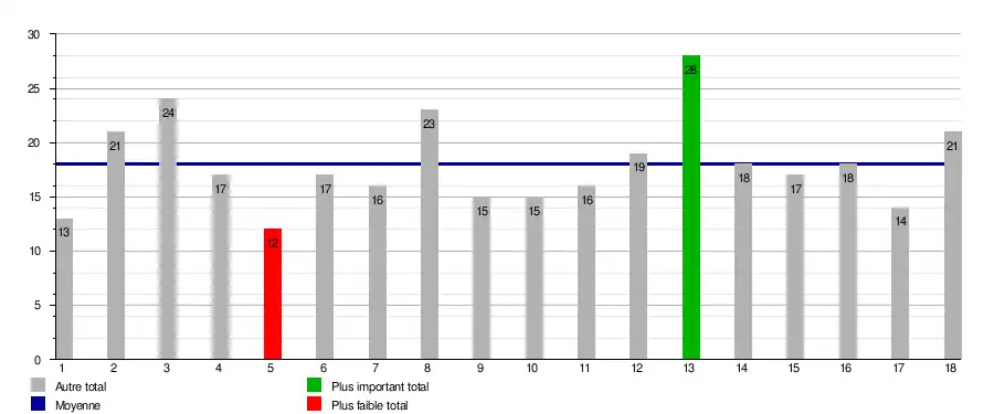 | Saint-Gall | 4 | 7 | 5 | 5 | 5 | 5 | 5 | 5 | 4 | 5 | 5 | 5 | 5 | 5 | 5 | 5 | 6 | 6 | ||