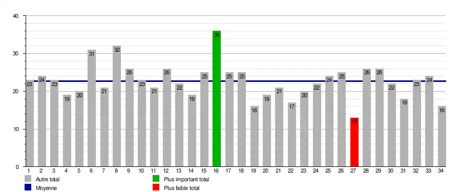 | Journée → | 1 | 2 | 3 | 4 | 5 | 6 | 7 | 8 | 9 | 10 | 11 | 12 | 13 | 14 | 15 | 16 | 17 | 18 | 19 | 20 | 21 | 22 | 23 | 24 | 25 | 26 | 27 | 28 | 29 | 30 | 31 | 32 | 33 | 34 | 1er | rel. |