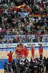En demi-finale, on assiste à une prise de pouvoir de l'Europe sur l'Amérique. La Grèce crée la première sensation de la journée en éliminant les États-Unis alors que dans les ultimes secondes l'Espagne se défaisait de l'Argentine, championne olympique et vice-championne du monde en titre[18]. La finale par contre est à sens unique. Pepu Hernández, entraîneur de la sélection espagnole, a perdu son père la veille de la finale[19]. Il a tenu à ne pas en informer l'équipe avant la fin du match pour ne pas perturber le groupe. Privée de Pau Gasol, blessé, l'Espagne entame le match de manière tonitruante, laissant rapidement à la traîne les Grecs, en peine avec leurs tirs extérieurs. Rien ne semble arrêter les Ibériques qui dominent tous les compartiments du jeu, emmenés par un Jorge Garbajosa en leader offensif. Les Grecs, peut-être émoussés par leur demi-finale, ne peuvent qu'assister, impuissants, au sacre des Espagnols comme nouveaux Campeones del mundo de baloncesto (« champions du monde de basket-ball » en espagnol)[20]. Ils sont honorés le soir même à leur rentrée au pays, dans la capitale Madrid[21]. L'équipe des États-Unis, qui finit troisième, a exigé de se faire remettre ses médailles à l'issue du match pour la troisième place (la veille de la finale) pour prendre son avion au plus vite. Elle n'était donc pas présente sur le podium.