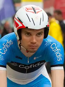 Rein Taaramäe vêtu de son maillot de champion d'Estonie du contre-la-montre lors du Critérium du Dauphiné 2012