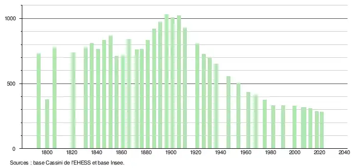 En 2021, la commune comptait 283 habitants[Note 7], en diminution de 5,98 % par rapport à 2015 (Dordogne : −0,41 %, France hors Mayotte : +1,84 %).