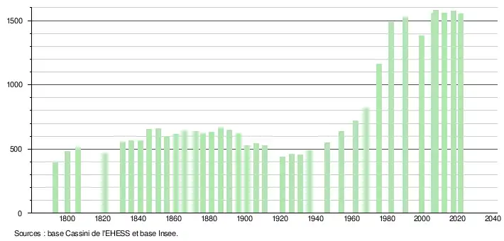 L'évolution du nombre d'habitants est connue à travers les recensements de la population effectués dans la commune depuis 1793. Pour les communes de moins de 10 000 habitants, une enquête de recensement portant sur toute la population est réalisée tous les cinq ans, les populations légales des années intermédiaires étant quant à elles estimées par interpolation ou extrapolation[16]. Pour la commune, le premier recensement exhaustif entrant dans le cadre du nouveau dispositif a été réalisé en 2007[17].