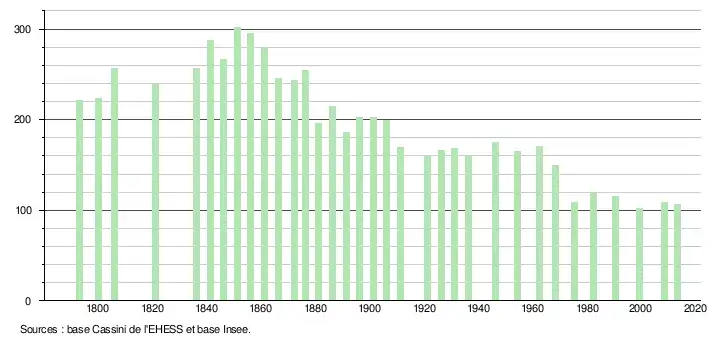 - Dans le tableau des recensements et le graphique, par convention dans Wikipédia, le principe a été retenu, pour les populations légales postérieures à 1999 de n’afficher dans le tableau des recensements et le graphique que les populations correspondant à l'année 2006, première population légale publiée calculée conformément aux concepts définis dans le décret no 2003-485 du 5 juin 2003, et les années correspondant à une enquête exhaustive de recensement pour les communes de moins de 10 000 habitants, ainsi que la dernière population légale publiée par l’Insee.