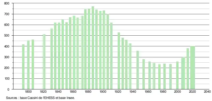 L'évolution du nombre d'habitants est connue à travers les recensements de la population effectués dans la commune depuis 1793. Pour les communes de moins de 10 000 habitants, une enquête de recensement portant sur toute la population est réalisée tous les cinq ans, les populations légales des années intermédiaires étant quant à elles estimées par interpolation ou extrapolation[24]. Pour la commune, le premier recensement exhaustif entrant dans le cadre du nouveau dispositif a été réalisé en 2008[25].