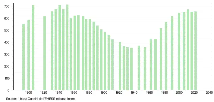 L'évolution du nombre d'habitants est connue à travers les recensements de la population effectués dans la commune depuis 1793. Pour les communes de moins de 10 000 habitants, une enquête de recensement portant sur toute la population est réalisée tous les cinq ans, les populations légales des années intermédiaires étant quant à elles estimées par interpolation ou extrapolation[17]. Pour la commune, le premier recensement exhaustif entrant dans le cadre du nouveau dispositif a été réalisé en 2006[18].