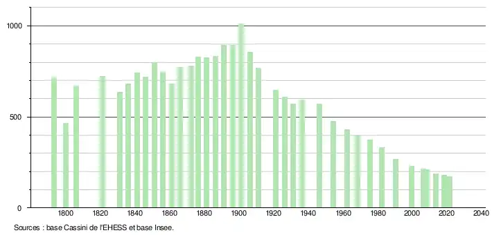 L'évolution du nombre d'habitants est connue à travers les recensements de la population effectués dans la commune depuis 1793. Pour les communes de moins de 10 000 habitants, une enquête de recensement portant sur toute la population est réalisée tous les cinq ans, les populations légales des années intermédiaires étant quant à elles estimées par interpolation ou extrapolation[17]. Pour la commune, le premier recensement exhaustif entrant dans le cadre du nouveau dispositif a été réalisé en 2008[18].