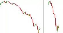 - un rectangle vertical, de largeur fixe, joint le cours d'ouverture au cours de fermeture ; il est coloré en noir (ou en rouge) si le cours de clôture est inférieur au cours d'ouverture, en blanc (ou en vert) dans le cas contraire ;