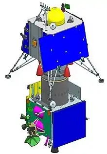 Chandrayaan-2 dont la masse totale est de 3 850 kg au décollage comprend trois composants[28] :