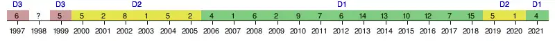 La frise ci-dessous résume les classements successifs du club en championnat depuis la saison 1997.