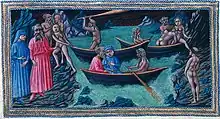 Charon pousse les âmes dans la barque, illustration de Paul Gustave Doré En regardant au-delà, Dante voit des gens entassés sur la rive d'un grand fleuve, prêts à le traverser, et il demande à Virgile qui ils sont : il ne le saura que lorsqu'ils atteindront la triste rive de l'Achéron. Dante a alors honte de son impatience et, le regard honteux et grave, s'abstient de parler jusqu'à ce qu'ils atteignent le rivage.