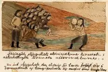 |  | Photographie d'une figurine en bois représentant un homme-esprit (angakoq) à côté duquel est placé un tambour[2]. Photo: A. Mikkelsen, Musée national du Danemark. |