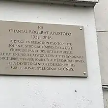 On trouvera au 50 rue Édouard Pailleron à Paris 19e, où se trouvait le siège du magazine Antoinette (CGT), une plaque commémorative en son honneur. La cérémonie de dévoilement de la plaque a été organisée par la Ville de Paris le 3 mars 2020 en présence de différentes personnalités du monde syndical, féministe et académique. Margaret Maruani a notamment témoigné de l'engagement de Chantal Rogerat auprès de la revue Travail, Genre et Sociétés.