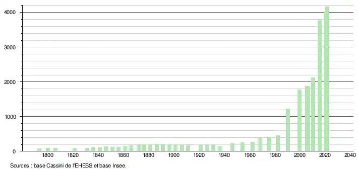 L'évolution du nombre d'habitants est connue à travers les recensements de la population effectués dans la commune depuis 1793. Pour les communes de moins de 10 000 habitants, une enquête de recensement portant sur toute la population est réalisée tous les cinq ans, les populations légales des années intermédiaires étant quant à elles estimées par interpolation ou extrapolation[38]. Pour la commune, le premier recensement exhaustif entrant dans le cadre du nouveau dispositif a été réalisé en 2005[39].