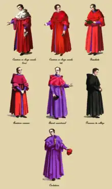 Les camériers secrets et les camériers d'honneur portaient une chape écarlate avec des agréments de couleur ponceau (rouge très vif) ; les avocats consistoriaux, la chape violette avec agréments de soie cramoisie et un chaperon ouvert à l'avant, les procureurs du collège une chape entièrement noire, avec les agréments de soie noire et un chaperon sans fourrure. Les caudataires des cardinaux, portent, sur une soutane violette boutonnée de noir, une sorte de chape de laine violette, avec revers de soie violette et un chaperon de soie mis de travers qui lui a valu le nom italien de crocia (croisière)[3].