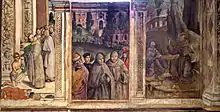 Les autres personnages qui peuplent la place mettent en scène une série de miracles accomplis par le saint de son vivant : la guérison d'un aveugle (qui montre ses yeux), la résurrection d'un possédé, la guérison de l'enfant mort-né de Jean et Marguerite da Basilea, la guérison de Lorenzo di Niccolò da Prato blessé par un taureau et la pacification des familles ombriennes[12],[14].